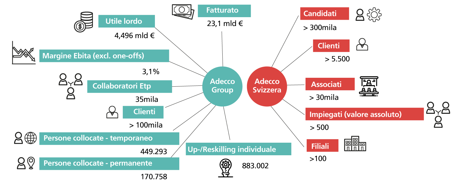 Leader su scala internazionale ed europea, in Svizzera Adecco detiene una quota di mercato a doppia cifra. La rete nazionale conta un centinaio di filiali in oltre 50 località e più di 400 collaboratori. Il portafoglio clienti spazia dalle multinazionali alle grandi aziende fino a un’ampia base di Pmi, con un mix equilibrato di attività: il personale temporaneo rappresenta la parte più consistente dei volumi, ma il reclutamento permanente e di professionisti specializzati – seppur numericamente inferiore – è di importanza cruciale.
