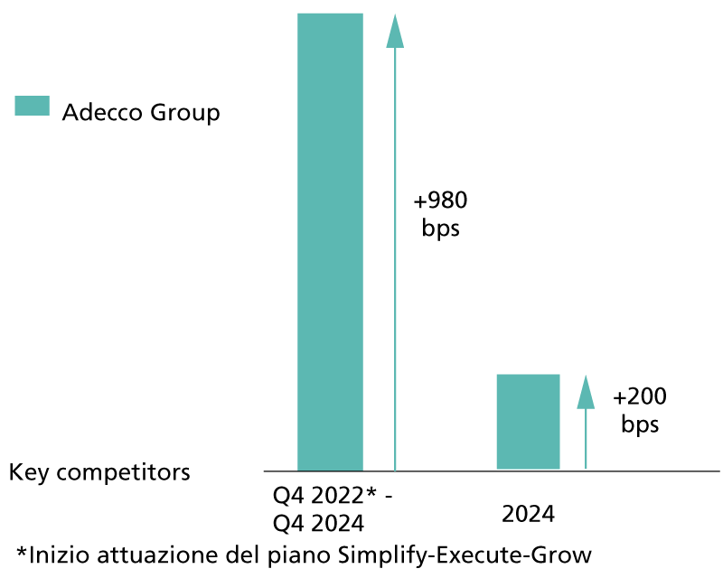 A sostenere la solidità e l’agilità del Gruppo contribuisce anche il piano Future@Work, che ha ridefinito strategia e cultura aziendale attorno a tre pilastri: “Semplificare” per snellire i processi e migliorare l’efficacia organizzativa, “Eseguire” per avvicinare il processo decisionale ai clienti e “Crescere” per ampliare ulteriormente la quota di mercato. «Questa strategia ci aiuta a bilanciare disciplina e ambizione. Gestendo un’attività più snella contribuiamo agli obiettivi di riduzione del debito del Gruppo, senza rinunciare a investimenti nelle aree di crescita come le soluzioni digitali e l’upskilling», rileva Marcel Keller. Un approccio che nel 2024 – secondo anno di attuazione – si è tradotto in una crescita relativa dei ricavi pari a +200 punti base rispetto ai principali concorrenti.
