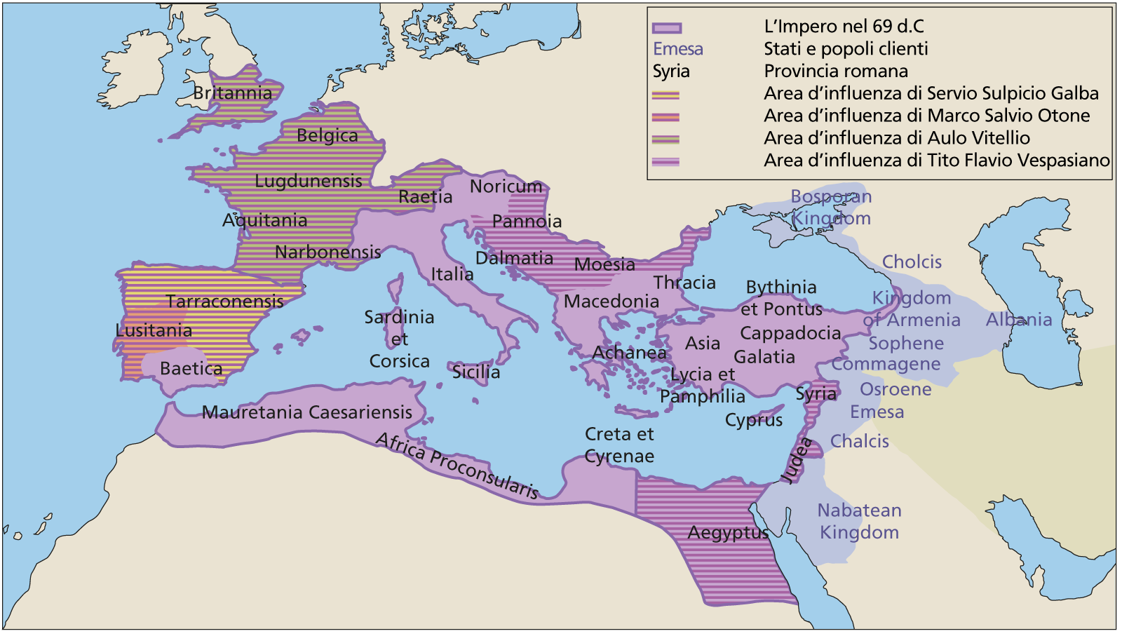 La prima fase critica d’incertezza, seppur fulminea, fu il cambio di dinastia tra coloro che avevano fondato l’Impero, la dinastia Giulio-Claudia, e quella Flavia. Nel biennio 68-69, dunque con la morte di Nerone, a succedersi sul soglio imperiale furono ben 5 imperatori o aspiranti tali, prima che Vespasiano riprendesse le redini dell’impero, garantendo un altro decennio di pace e stabilità. Il 69 d.C. è intanto divenuto noto alle cronache quale l’anno dei quattro imperatori, con l’altrettanto celebre infelice terzezzo di Galba, Otone, e Vitellio, che salvo di nome non hanno certo potuto lasciare il segno.