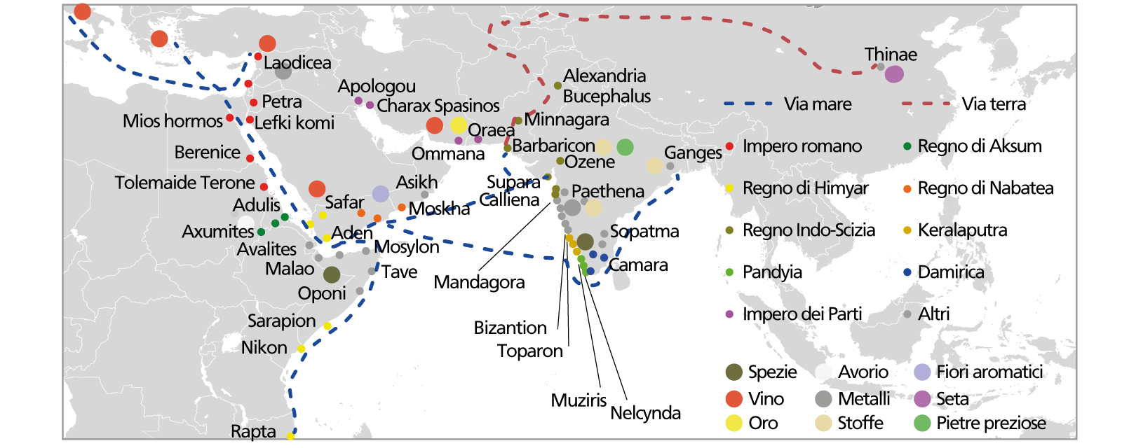 Erano oltre 120 le navi che ogni anno facevano la spola tra Egitto e sud dell’India, con un disavanzo commerciale stimato in non meno di 100 milioni negli anni buoni. Una singola spedizione da Muziris ad Alessandria, di cui Plinio conserva doviziosa traccia, inventariava tra gli altri 2.100 kg di avorio, oltre 700 di incenso himalayano, ben 360 di stoffe e tessuti, probabilmente cotone prezioso almeno quanto la seta, per un totale di 150 tonnellate di merci, per un controvalore di 131 talenti, sufficienti a comprare 850 ettari del migliore terreno agricolo dell’Egitto, tra i più costosi del tempo. A testimoniare le cifre in ballo un’ingente quantità di monete d’oro romane in India coniate tra il I e il V secolo, quando i rapporti commerciali diretti vennero meno.