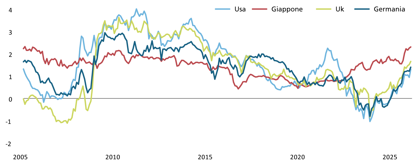 L’obbligazionario ha visto impennarsi i rendimenti di alcuni titoli di Stato a lungo termine. In gergo si dice che le curve dei rendimenti sono diventate più ripide. In assenza di attese di forte espansione economica, questa impennata è dovuta ai timori riguardanti la traiettoria del debito di alcuni Paesi.